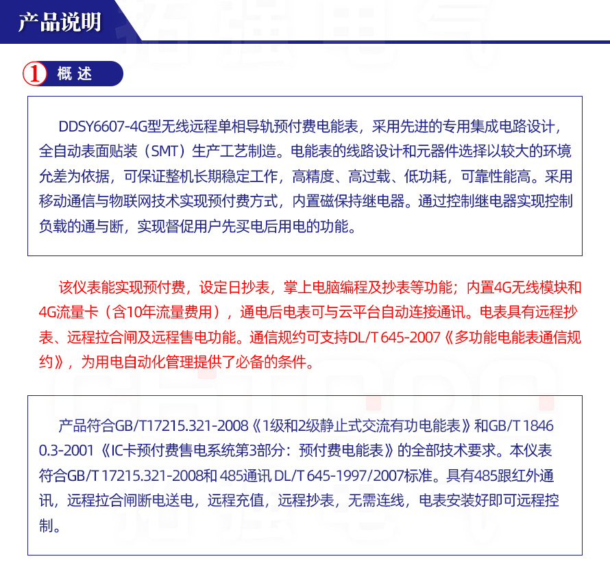 DDSY6607型系列GPRS遠(yuǎn)程導(dǎo)軌式單相預(yù)付費電能表采用屏蔽式、密封型結(jié)構(gòu),用單片微控制器進(jìn)行數(shù)據(jù)采集,處理和保存。具有良好的抗電磁干擾,低功耗,高準(zhǔn)確度了,高過載,長壽命。安全符合GB/T17215-2002、GB/T18460.3-2001和DL/T645-1997標(biāo)準(zhǔn)中對電子式單相預(yù)付費電度表的全部技術(shù)要求。