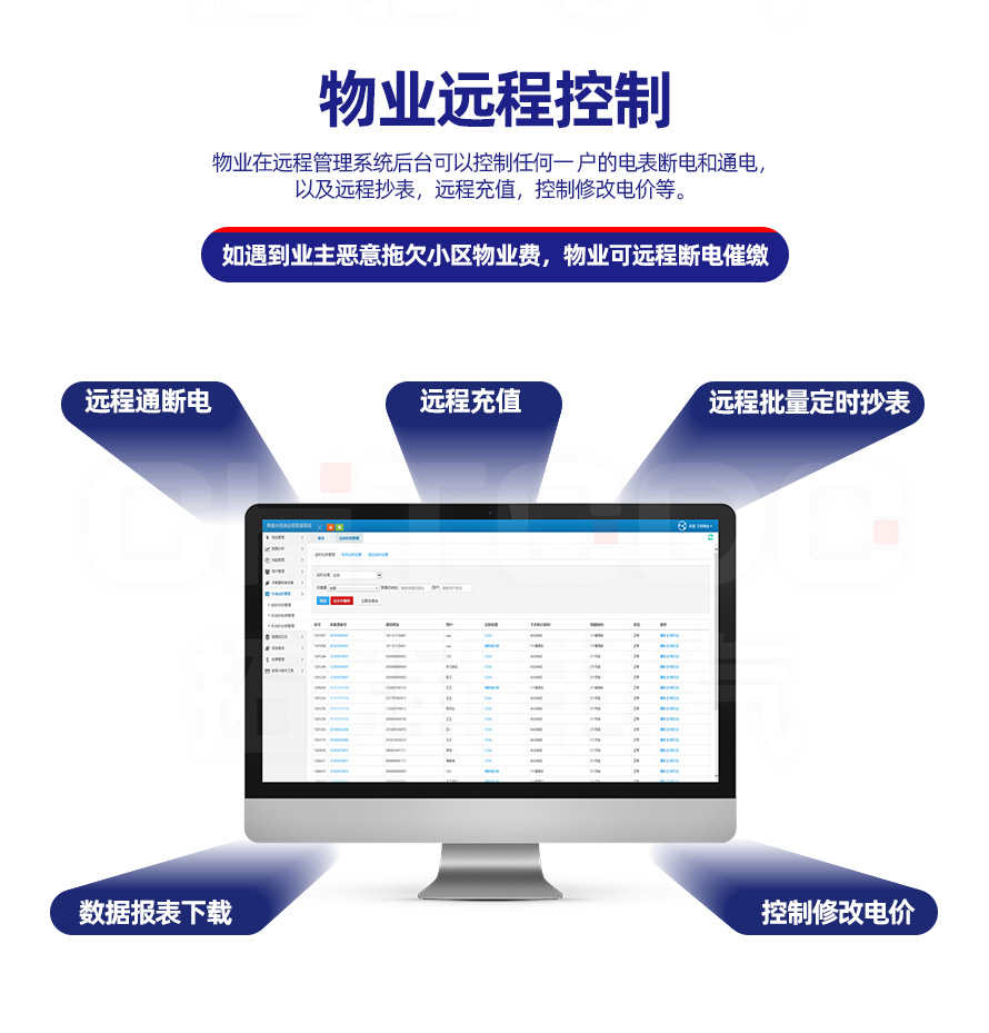 電表可與本公司遠(yuǎn)程抄表系統(tǒng)和手機APP配套使用,遠(yuǎn)程抄表管理系統(tǒng)具有實時抄表、定時抄表外,還提供了設(shè)備管理功能,如告警、余額短信通知、遠(yuǎn)程充值、手機抄表、手機查詢、手機充值、預(yù)付費、后付費、自助充值機充值、遠(yuǎn)程拉合閘、各種查詢報表、統(tǒng)計報表下載等功能。