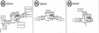 7.1.7將表接頭套入接頭螺母后安裝到管道上,然后扭轉(zhuǎn)接頭螺母將遠(yuǎn)傳有線閥控水表安裝到管道上,保持遠(yuǎn)傳有線閥控水表讀數(shù)盤水平向上,水表與管道連接時(shí)不應(yīng)受過(guò)大的折彎力,以避免損壞遠(yuǎn)傳有線閥控水表接口斷裂。禁止出現(xiàn)如下圖所式安裝方式: